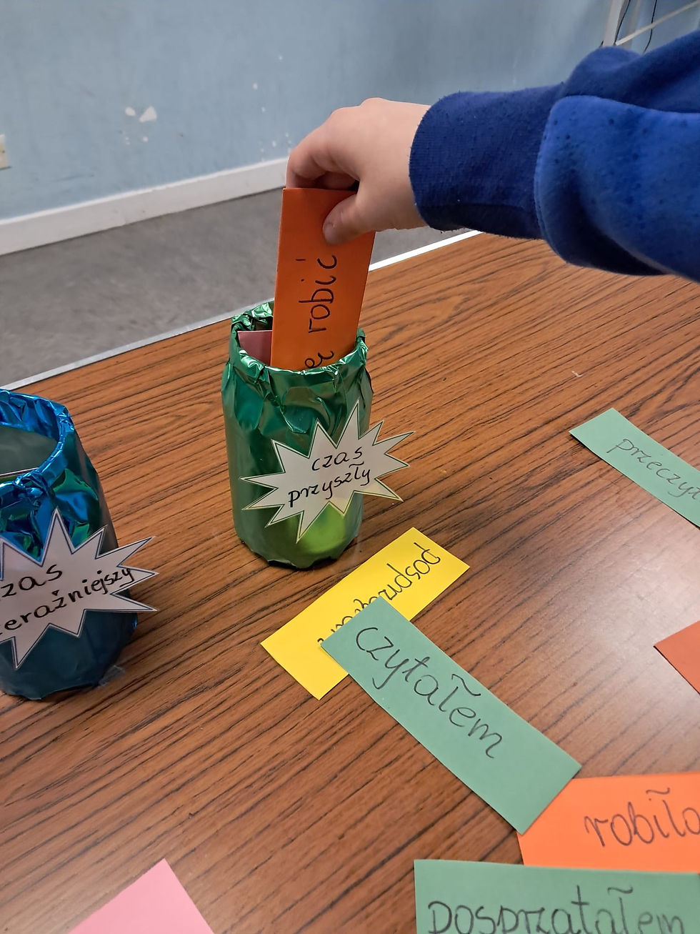 Czytaliśmy „Domowe przedstawienie” Grzegorza Kasdepke, ogarnialiśmy czasowniki (formy, czasy) i uczyliśmy się, jak napisać dobre opowiadanie. Była też zabawa „Trzy słoiki” – nauka zamieniona w grę!